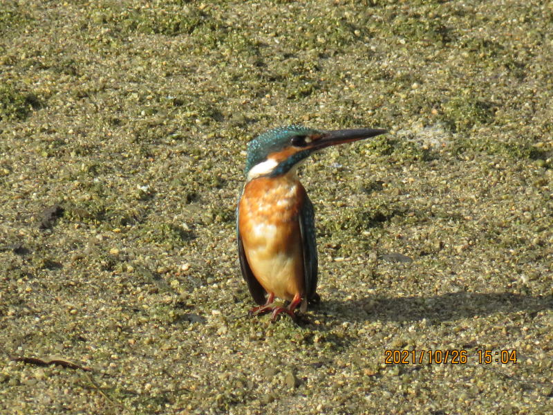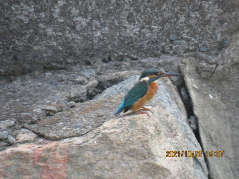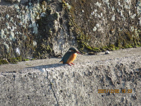 15時に来た時は潮が引いていなかったので,1時間後に来ました。2回くらい回って,帰る前にもう一度念のために見るとカワセミが川の壁のコンクリートの上にとまっていました。カメラを出す間に飛んでいってしまいました。飛んでいった方をのぞいているといつもの場所の方へ飛んでいくのが見えました。