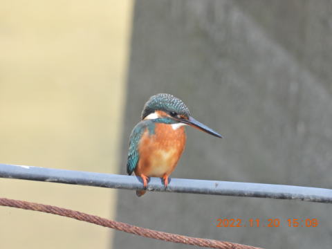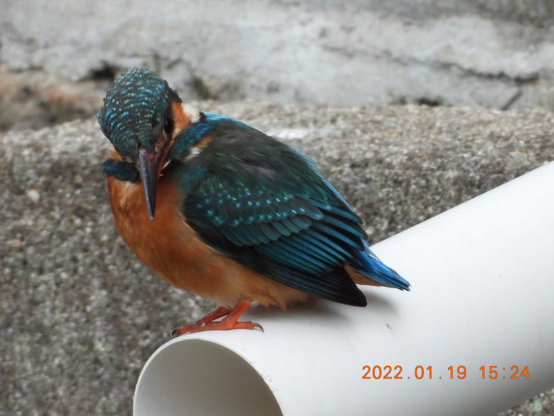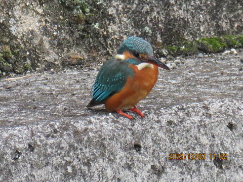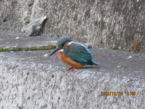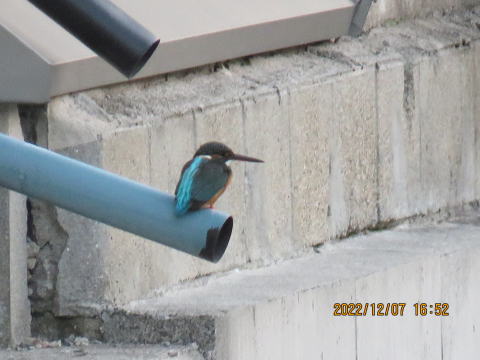 いつもの場所に行く前に川沿いのコンクリートの上を見ると,遠くにカワセミがいました。Nikon COOLPIX P1000で撮ってます。