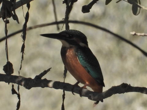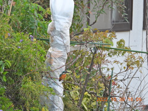 くちばしの下が赤く見えるので昨日と同じカワセミでしょう。すぐに気づかれて飛んでいきました。