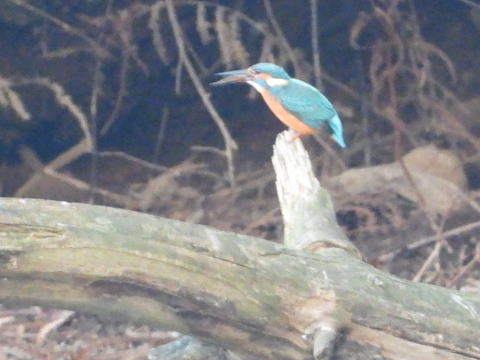 しばらく見まわしていましたがカワセミの姿は見えませんでした。すると,カワセミの鳴き声が聞こえました。声のする方を見るとうっすら青いものが見えました。カワセミでした。急いでカメラを出して撮りましたが,すぐに姿は見えなくなりました。