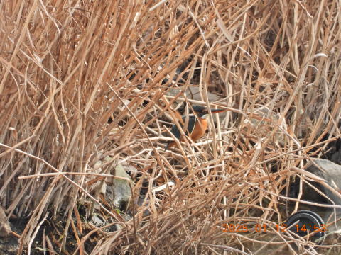 14時50分頃来ました。橋からいつもの下流側を見てもカワセミの反応はありませんでした。少ししてアオサギが川に降りて魚を捕りました。すると,カワセミの鳴き声がしていつもの草むらに飛んでいくのが見えました。