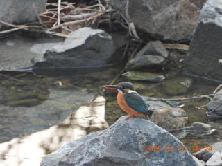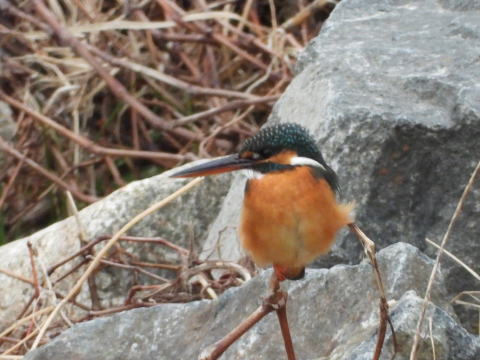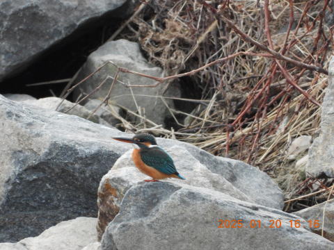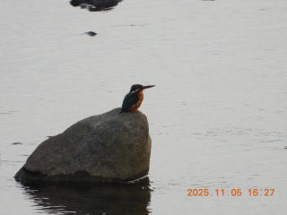 16時少し前に来ました。いつもの場所にはカワセミはいませんでした。橋から川下側を見ていると,何かが動きました。たくさん石がありましたが,カワセミがとまっているのに気づきました。