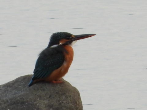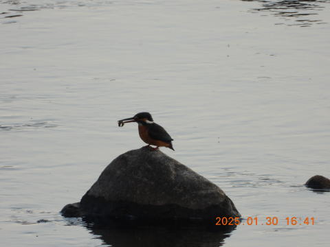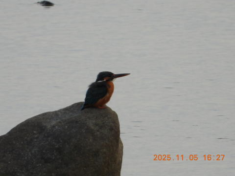 16時35分頃来ました。いつもの場所に行って川をのぞきましたが,反応はありませんでした。しばらくすると,カワセミの鳴き声がしました。鳴き声がするいつもの場所のとなりを見ると,川の石の上にカワセミのシルエットが見えました。