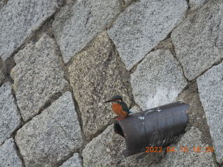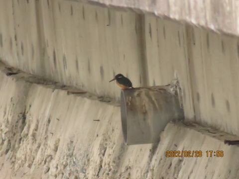 仙兵衛橋から上流側を見ると,左の写真の中央から左寄りの土管の上にカワセミがいるように見えました。よく見ると壁の穴でした。ふと,さらに上流側の土管を見ると,カワセミがいました。