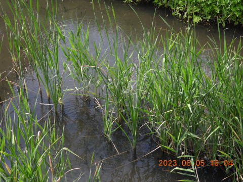昨年草を刈ったにもかかわらずそれ以上に草が育っている状況でした。一面水面が見えない状態でしたが,2~3回大雨が降ったので水路ができていました。以前は歩道沿いに水路がありましたが,川の中央付近に水路ができていました。