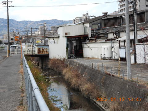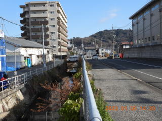 いつもの場所に行くと,カワセミが上流に飛んで行きました。たぶんもどってくるだろうと思っていると,もどってきて,さらには道路を越えて工場と隣の家の間に飛んでいきました。そこはほそい路地で,小さな水路がありました。