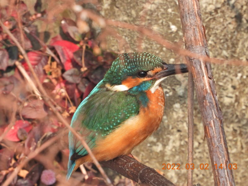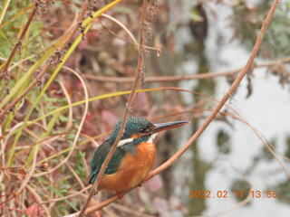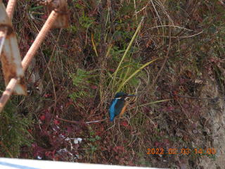 いつもの場所に行くとカワセミはいませんでした。何回か往復して上流に行くと,カワセミが飛び立ち,道路を越えて右側の建物の方へ飛んでいきました。その後,いつもの場所に行くと,カワセミが下流に飛んでいきました。もどってくるかと思って待っていましたが,カワセミは現れませんでした。風がとても冷たい日でした。