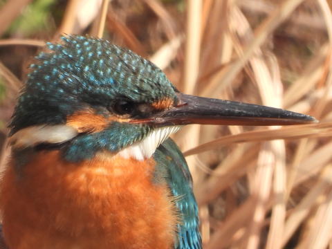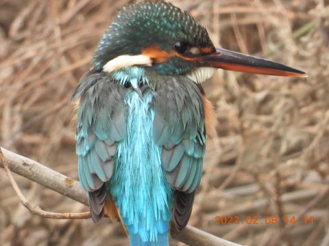 今日はいつもの場所に行ってもカワセミは出てきませんでした。上流へ行ってみるとカワセミが飛び出しました。何とか目視ができる所にとまりましたが,草の中なので草がじゃまでした。風が強かったので,草がじゃまにならないタイミングで写真を撮りました。Nikon COOLPIX P1000で撮っています。