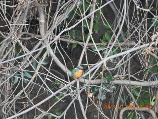 この後いつもの場所に飛んでいき,その後分からなくなりました。帰る前にまた左側のつるの切れ目を見ていると,奥の方にカワセミっぽいものが見えました。