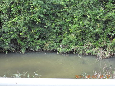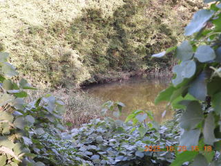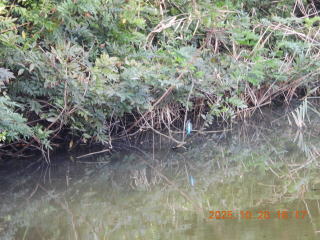 17時20分頃来ました。いつもの場所を見ると,写真の中央辺りにカワセミがいました。急いでカメラを取りに行ってもどってくると,カワセミはいませんでした。それでも少し粘っていると,写真の中央左少し上付近からカワセミがダイブして写真の少し右少し上あたりのフジの花辺りに飛んでいきました。カメラで探していると,カワセミは右の奥の方へ飛んでいきました。
