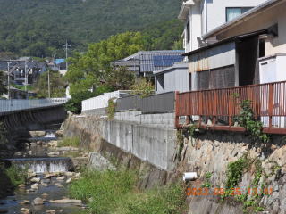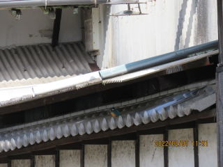 よく見る下流に行くと,カワセミはいないように見えました。以前,右の家の屋根の方からダイブしたのを思い出し,よく見てみると2段の屋根の下にいるのが見えました。