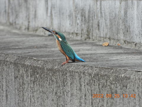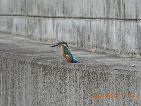 いつもの中流まで行って,帰りに最近よくいる下流の橋に寄りました。カワセミはいませんでしたが,もう一度一つ上流側の橋に行って,またもどってくると,カワセミの声が聞こえたような気がしました。すると,カワセミが現れました。