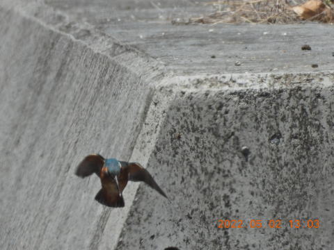 14時頃,昨日と同じく上流から中流にもどっていると,カワセミが中流側から飛んできました。魚をくわえているかは分かりませんでした。そして,方向を変えて一昨日の民家の上を飛んでいきました。