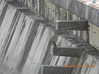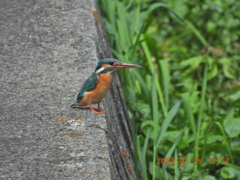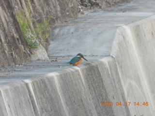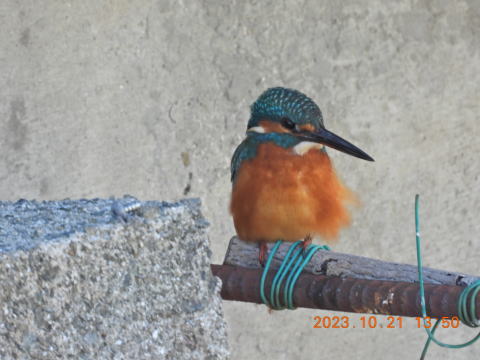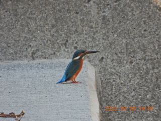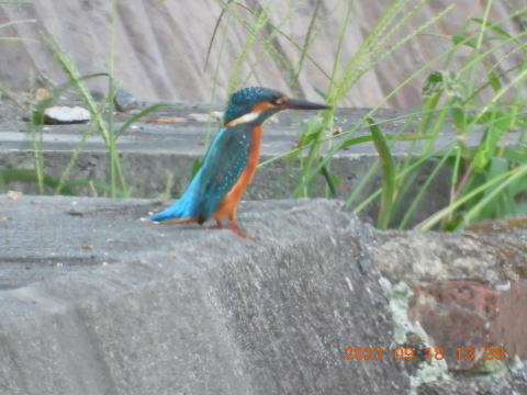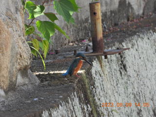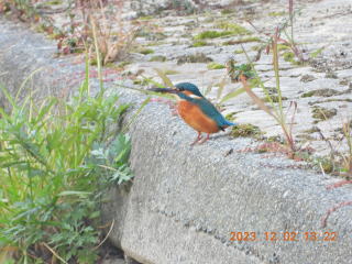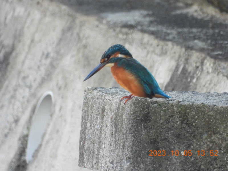下流の橋上からその付近を見ているとカワセミがコンクリートの土手の上にとまりました。