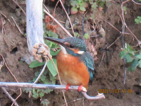 15時前に来ました。河原を歩いているとカワセミの鳴き声がしました。そちらの方を見ると何かが動いていました。カワセミが大きな魚を食べようとしていました。しかし,カメラを向けると魚をくわえたまま上流側に飛んでいきました。