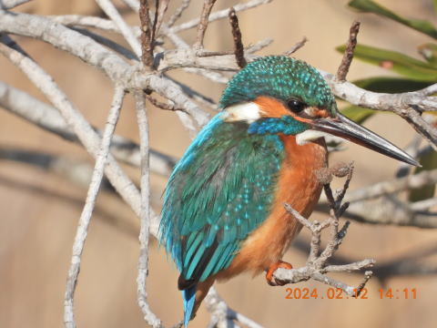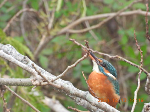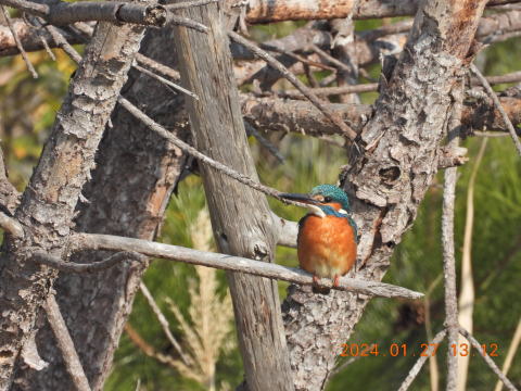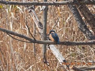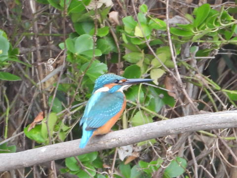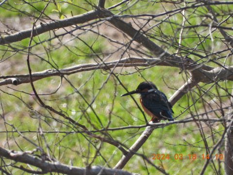 12時30分頃来ました。水路の西側へ歩いていると,チッチというカワセミの鳴き声がしました。その方向へ行くと木の枝に何かいるように見えました。さらに近づくとカワセミでした。慌ててカメラで撮りました。