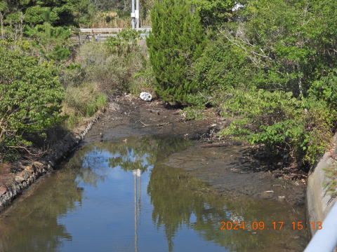 15時15分頃再度来ました。水路を1往復して帰ろうかと思ったところ,カワセミの鳴き声が聞こえたので,西側へ少し歩いていくと,カワセミが1つ向こうの水路から東側へ飛びさらに道路を超えて海の方へ飛んでいきました。