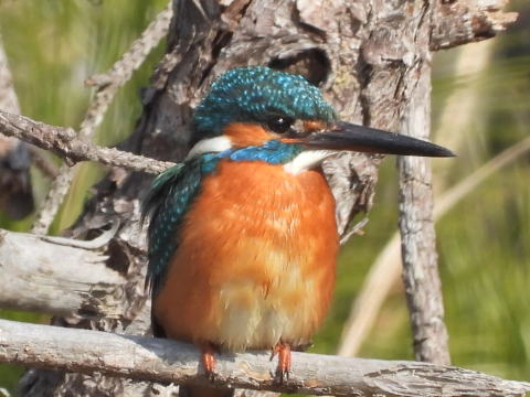 水路を西側へ行くと,遠くの倒木にカワセミがいました。