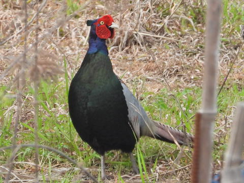 14時頃来ました。カワセミは見ませんでした。キジの鳴き声が2ケ所から聞こえていました。すると,大きな鳥が動くのが見えました。左上の真ん中少し左に2羽のキジがいました。フェンスを隔てて右側には畑仕事をしている人もいました。