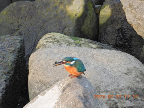 カワセミがもう1羽いるのが見えました。先日までは下流側にいたメスが上流側にいるということは,オスの求愛が成功したのでしょうか。しかし,オスの捕る魚が小さいですけど大丈夫なのでしょうか。