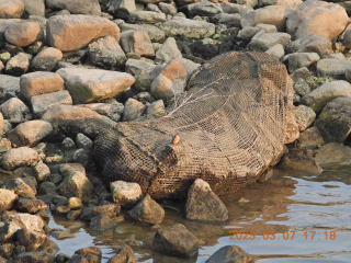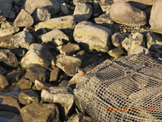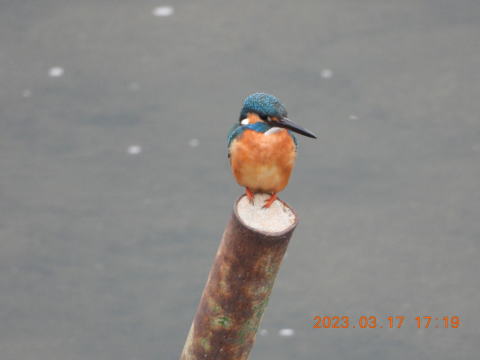 17時20分頃来ました。いつもの場所に行くとカワセミが上流側へ飛んでいきました。あの杭にいたのでしょうか。前回メスがいた場所を見ましたがいませんでした。下流側はなぜかいまさら工事を始めたようで,カワセミはいませんでした。