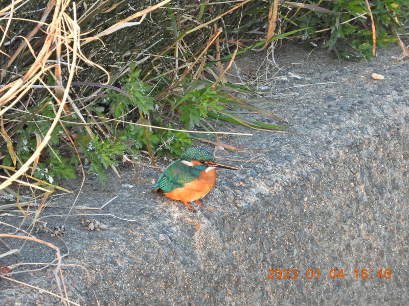 16時40分頃来ました。今日はいないかと思って上流をながめた後,下流に顔を向けるとカワセミの鳴き声がしました。鳴き声がした方を見て,2分間くらいした後カワセミが飛んできました。