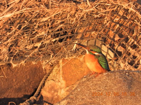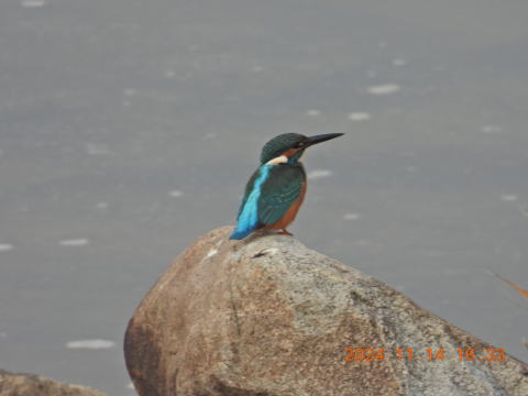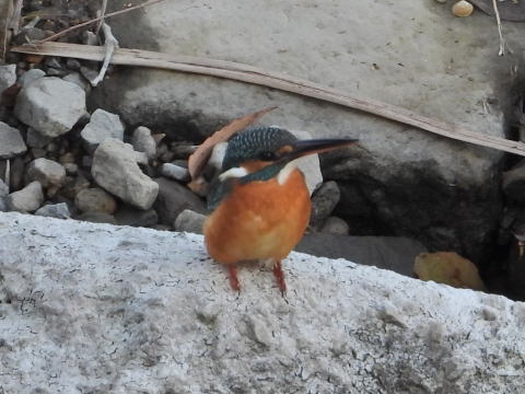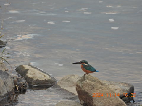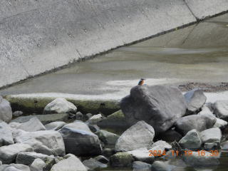 16時30分頃来ました。橋の上から見てもカワセミらしきものは見えませんでした。しばらくいると,カワセミのような鳴き声が聞こえました。下流側を見るとカワセミが飛んできて右側の岸の石の上にとまりました。