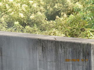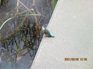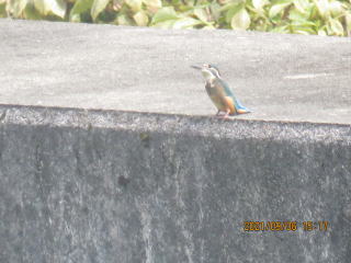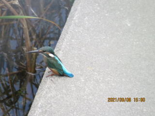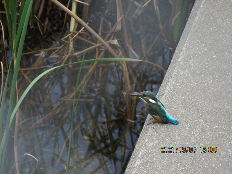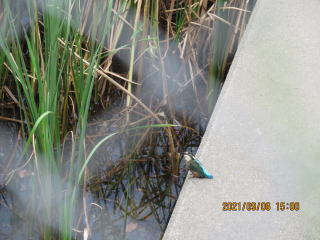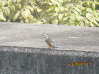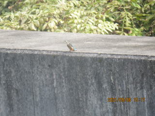 この後,2つの池を回ってから再び貯水池を見てみると,塀の上のコンクリートに何かがいると思い,カメラでのぞくとカワセミでした。