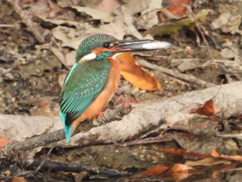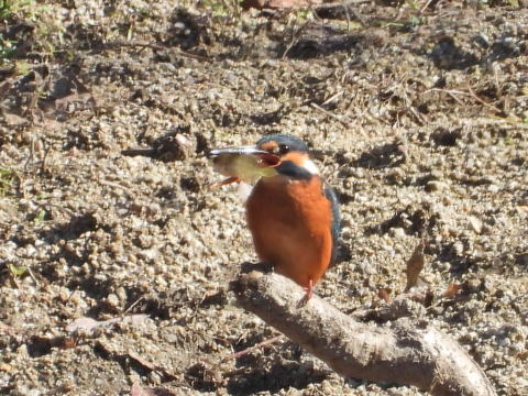 カワセミが魚を捕っていました。右の写真では魚の顔が見えます。メスの成鳥でしょうか。