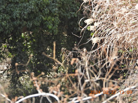 12時少し前に来ました。池を1周して前回見た水路に向かいました。遠くから以前いた場所を見ると何かいるように見えました。カワセミがいました。メスですね。ここには2羽いるのでしょうか。すぐに奥の方へ飛んでいきました。
